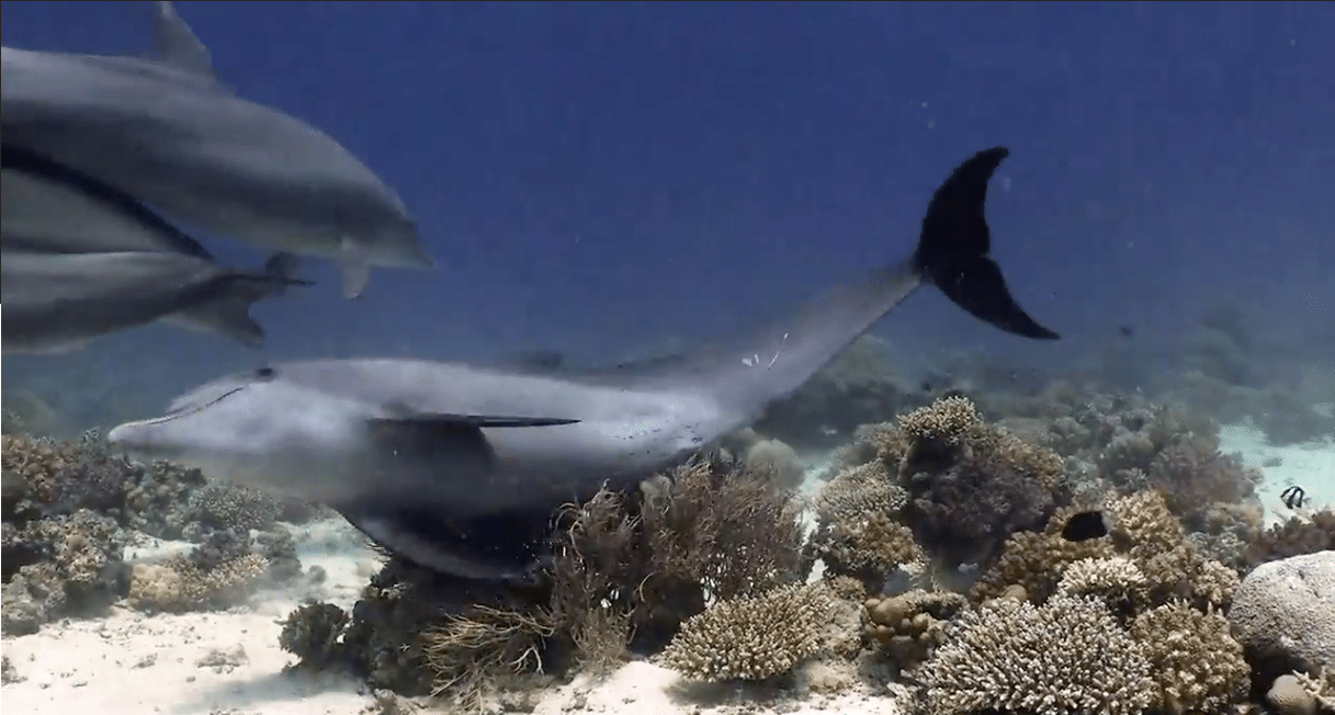 Elle a remarqué que les dauphins se frottaient parfois la tête et le ventre sur des coraux et des éponges au fond de l’eau. Mais pas n’importe lesquels ! Ils les choisissent avec soin et attendent même en file pour venir se frotter à eux. Ils se retrouvent recouverts du mucus produit par ces coraux et ces éponges, au point de devenir un peu jaunes ou verts.