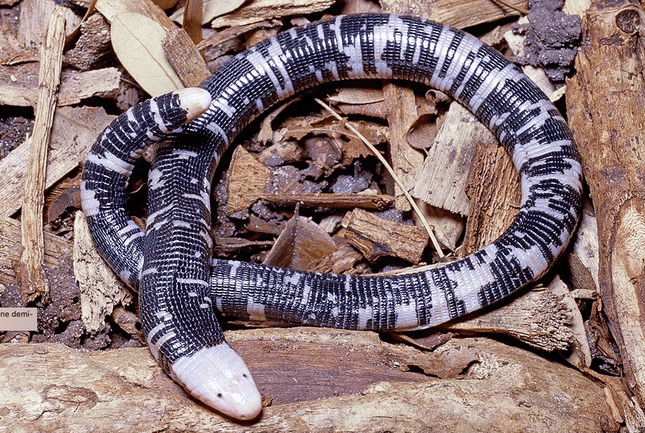 Officiellement membre de la famille des reptiles, il a des airs de gros ver de terre doté d’écailles. L’amphisbène possède une tête dans le prolongement du corps, il est donc difficile de différencier la tête de la queue. Cette particularité a probablement inspiré des mythes et légendes de serpents à deux têtes !