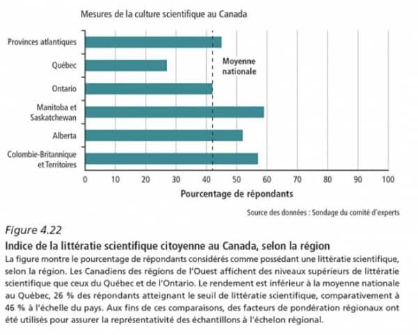 Le Conseil semble lui-même manifester une certaine réserve, puisqu’il a introduit dans son analyse le concept inédit d’«auto-rabat-jovialisme». «Malgré le bon classement obtenu par le Canada à l’échelle internationale, écrit-il, plus de la moitié des Canadiens ne possèdent pas le niveau de compréhension des notions élémentaires requis pour saisir le sens des grands débats publics sur les questions scientifiques. Le comité d’experts a constaté que 54% des Canadiens sont incapables d’expliquer ce que cela signifie que d’étudier quelque chose de manière scientifique.» Un bémol plutôt discordant dans l’hymne à la fierté nationale.