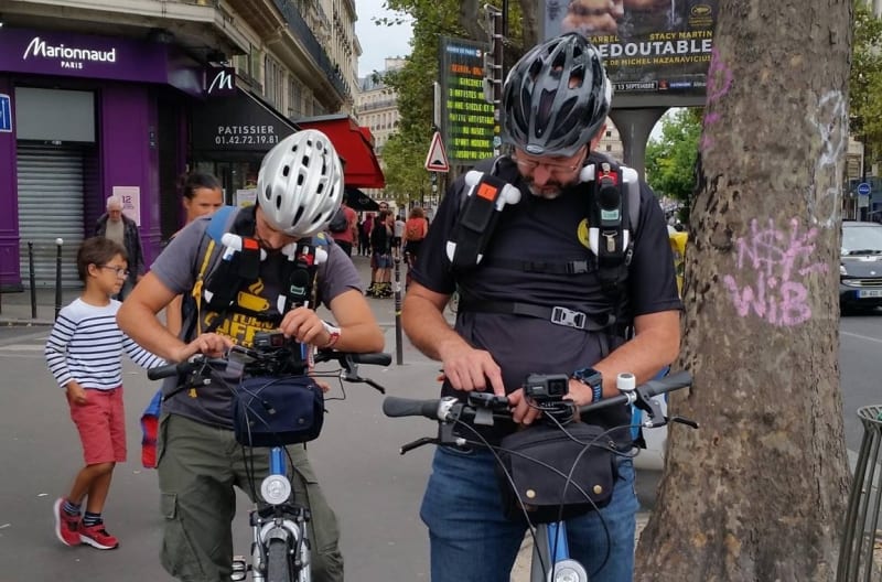 R : Pour standardiser les mesures, nous recourons à un appareillage identique lors de tous nos séjours. Nous avons des capteurs de NO2 et de particules fines, des sonomètres pour le bruit, des GPS pour analyser les trajets ainsi que des caméras d’action fixées sur le guidon de nos vélos urbains. Aussi, nous portons des vêtements biométriques Hexoskin, fabriqués à Montréal.
