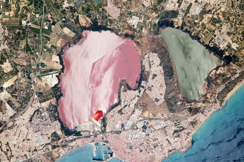 Des couleurs dans la ville de Torrevieja, en Espagne. On voit le bleu de la mer Méditerranée ainsi que les lagunes salées de La Mata (en vert) et de Torreviaja (en rose). C’est la présence d’un microorganisme, qui vit en association avec une algue qui pousse en milieux salés, qui produit cette teinte rose. De l’autre côté, La Mata contient beaucoup moins de sel.