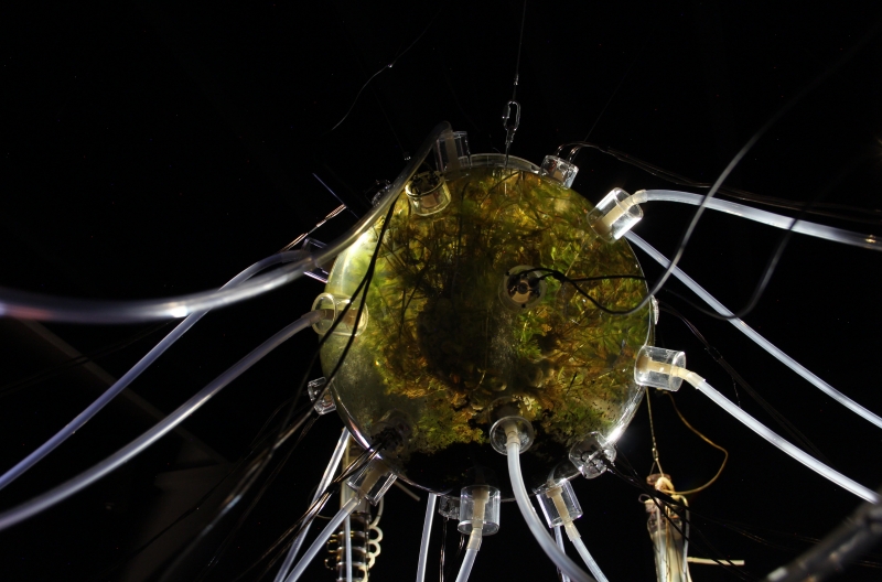À première vue, Plantas autofotosintéticas, de l’artiste mexicain Gilberto Esparza, a de quoi surprendre. Mi-appareil, mi-organisme, l’œuvre est conçue en collaboration avec des ingénieurs et des biologistes.