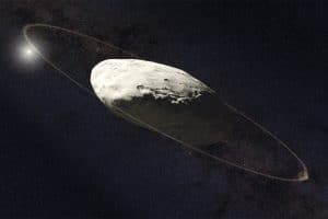 En 2017, des astronomes ont découvert un anneau autour de la planète naine Hauméa. L’anneau mesure environ 70 km de large et se trouve à 2287 km de l’astre (vue d’artiste). Image: Wikimedia Commons/Kevin Gill