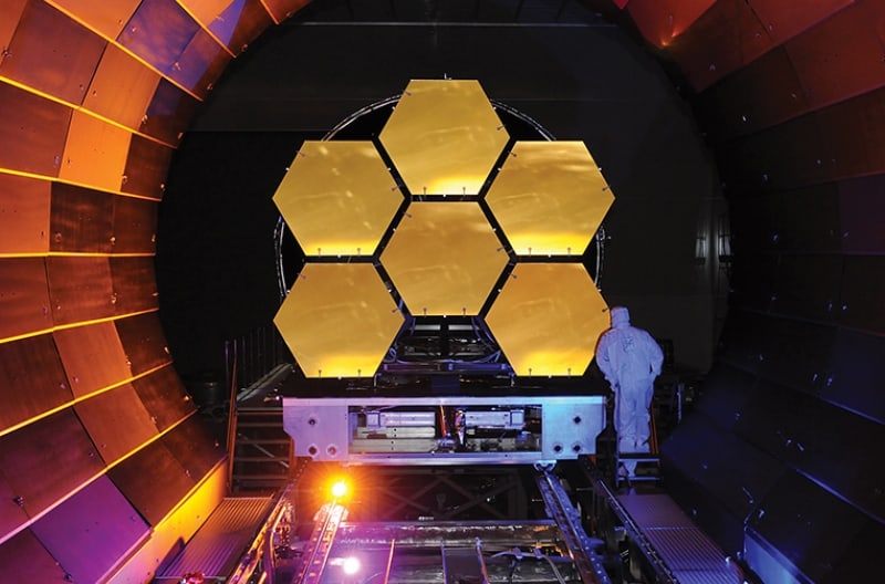 Fruit d’une collaboration entre la NASA, l’Agence spatiale européenne et l’Agence spatiale canadienne, le géant doré permettra à des milliers d’astronomes du monde entier d’en apprendre plus sur les débuts de l’Univers ainsi que sur la formation des premières étoiles et galaxies. Il « remontera » dans le passé, en captant la lumière émise environ 300 millions d’années après le big bang, au moment où se formaient les galaxies originelles. Une prouesse que l’on doit à ses miroirs recouverts d’or qui captent la lumière infrarouge. L’Univers étant en expansion, ces galaxies s’éloignent encore à toute vitesse de nous, ce qui ne les rend détectables que dans l’infrarouge. Le télescope Hubble en était incapable, car il captait seulement la lumière visible et les rayons UV.