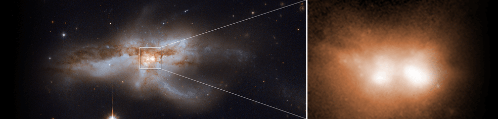 Stades finaux avant l’union d’une paire de noyaux galactiques. À gauche, l’image prise par Hubble; à droite, les deux noyaux actifs. Photo: NASA, ESA, et M. Koss (Eureka Scientific, Inc.)