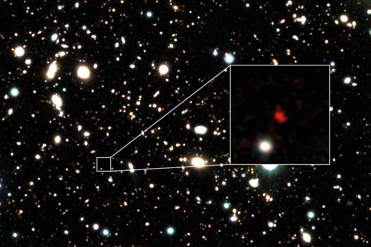 Le point rouge est HD1, la plus lointaine galaxie observée. Image: Wikimedia commons/Harikane et coll.