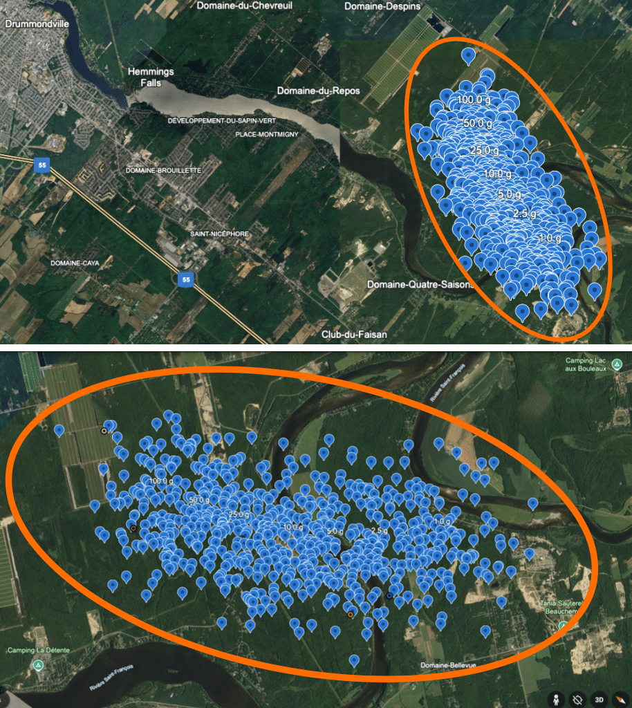 Cette carte montre la zone où la météorite pourrait être tombée, s’étendant le long de la rivière Saint-François, entre la Réserve et le Domaine-du-Repos. Image: Denis Vida