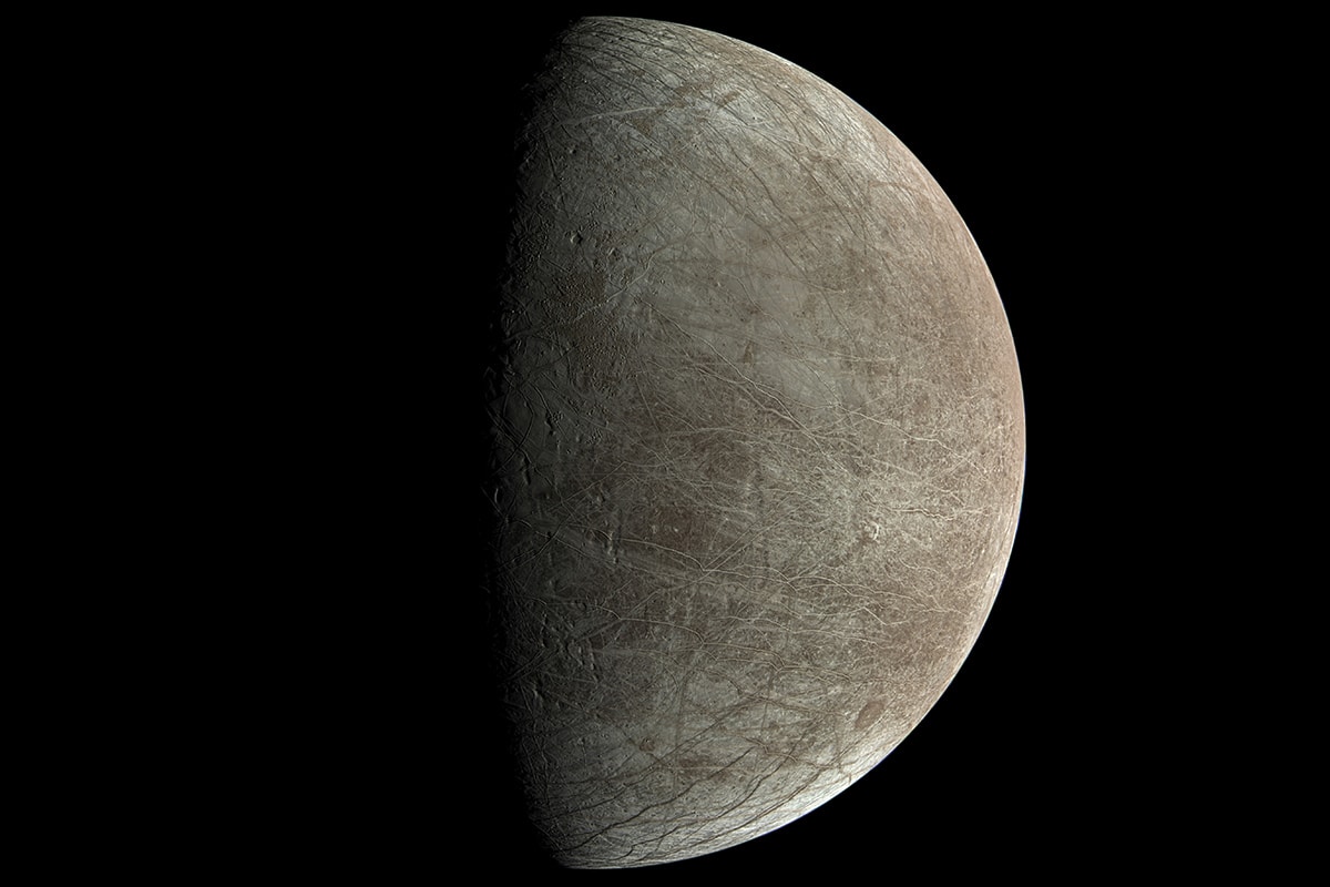 Europe, photographiée par la sonde Juno en 2022. Photo: Data: NASA/JPL-Caltech/SwRI/MSSS, Image processing by Björn Jónsson CC BY-NC-SA 2.0