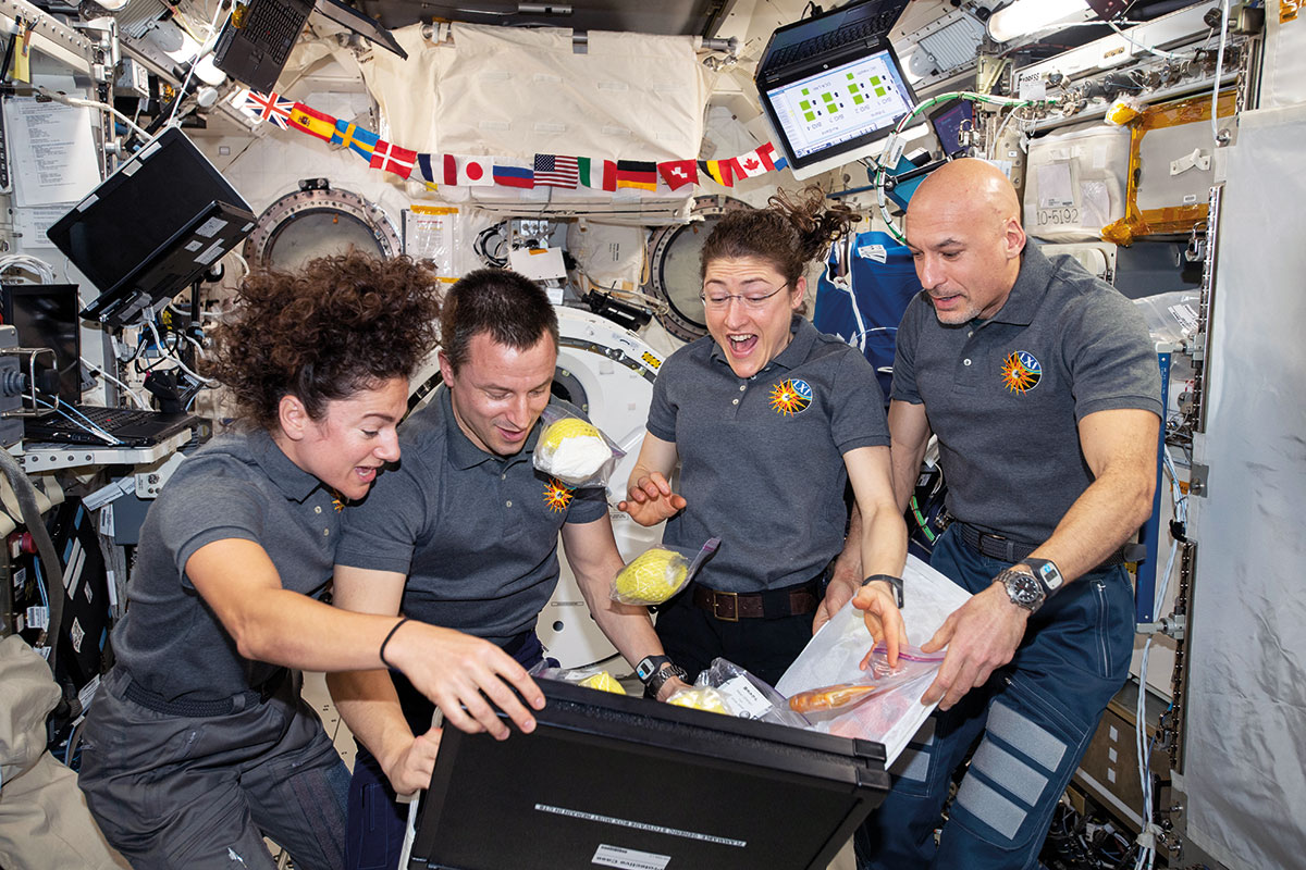 Des astronautes déballant des fruits frais et d’autres surprises lors de leur séjour dans la SSI en 2019. Photo: NASA