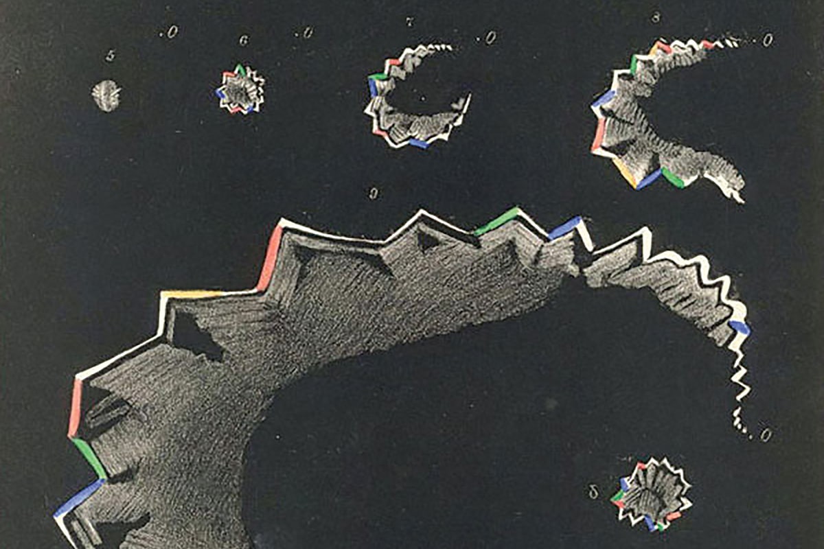 Représentation de l’aura par Hubert Airy (1870). Dans sa forme typique, elle commence par un « scotome scintillant », une petite tache aveugle avec un bord dentelé coloré, vacillant, qui s’étend en forme de C vers un côté du champ visuel. Image: Wikimedia Commons; publicdomainreview.org/collection