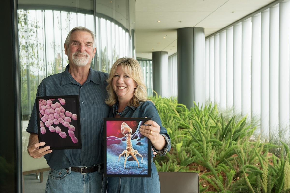Thomas Patterson tient une image de la bactérie Acinetobacter baumannii, tandis que Steffanie Strathdee présente une image d’un bactériophage, un virus capable d’infecter et de détruire cette bactérie. Photo: UCSD Health