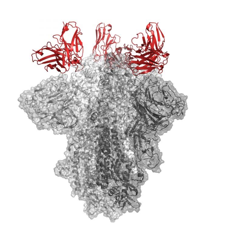 Image: Modèle validé expérimentalement de la protéine S du virus SARS-CoV-2 (en gris) liée à un anticorps isolé à partir du sang d’un patient guéri de la COVID-19 (en rouge). Seule la portion de l’anticorps se liant à l’antigène est représentée par simplicité.