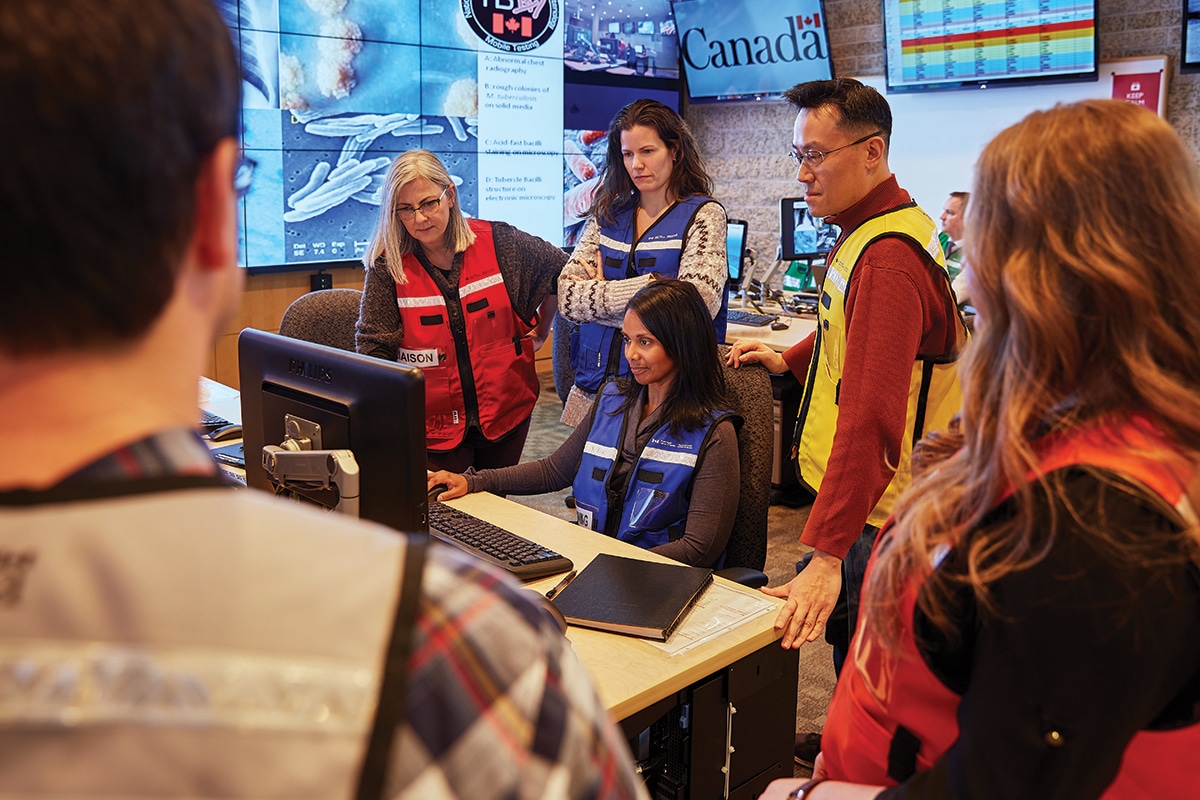En cas de crise, les équipes de Winnipeg formées à la gestion des urgences s’installent dans cette salle équipée de moyens de communication dernier cri et coordonnent les opérations. Il existe quatre niveaux d’urgence et, dans les situations les plus graves, tous les postes sont occupés 24 heures sur 24, 7 jours sur 7. En ces lieux, la hiérarchie habituelle vole en éclats: au total, 15 personnes sont en mesure de diriger le centre et c’est l’une d’elles qui prend les rênes. Autour des tables, chacun revêt un gilet de couleur qui permet de savoir dans quelle équipe il se trouve (logistique, communications…). Photo: NML / CORY ARONEC PHOTOGRAPHY LTD