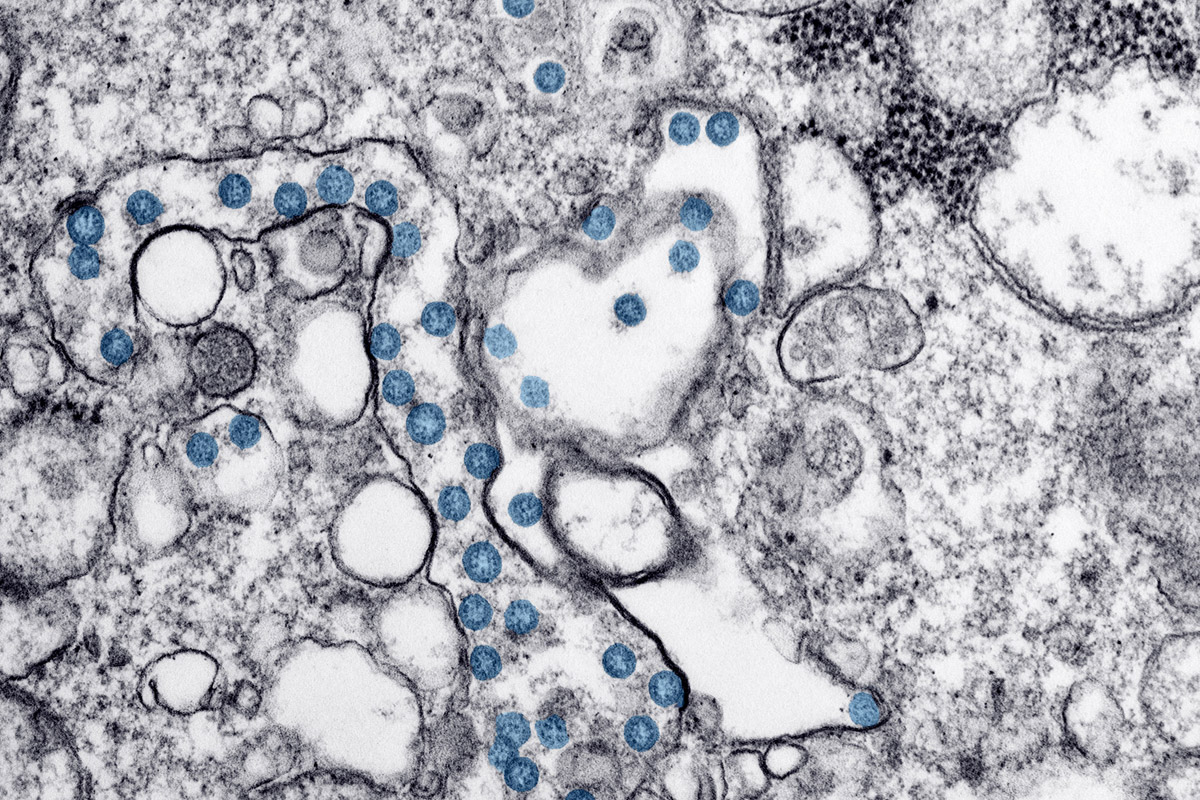 On voit ici les particules virales du SARS-CoV-2 colorées en bleu. Image : CDC/ Hannah A Bullock; Azaibi Tamin