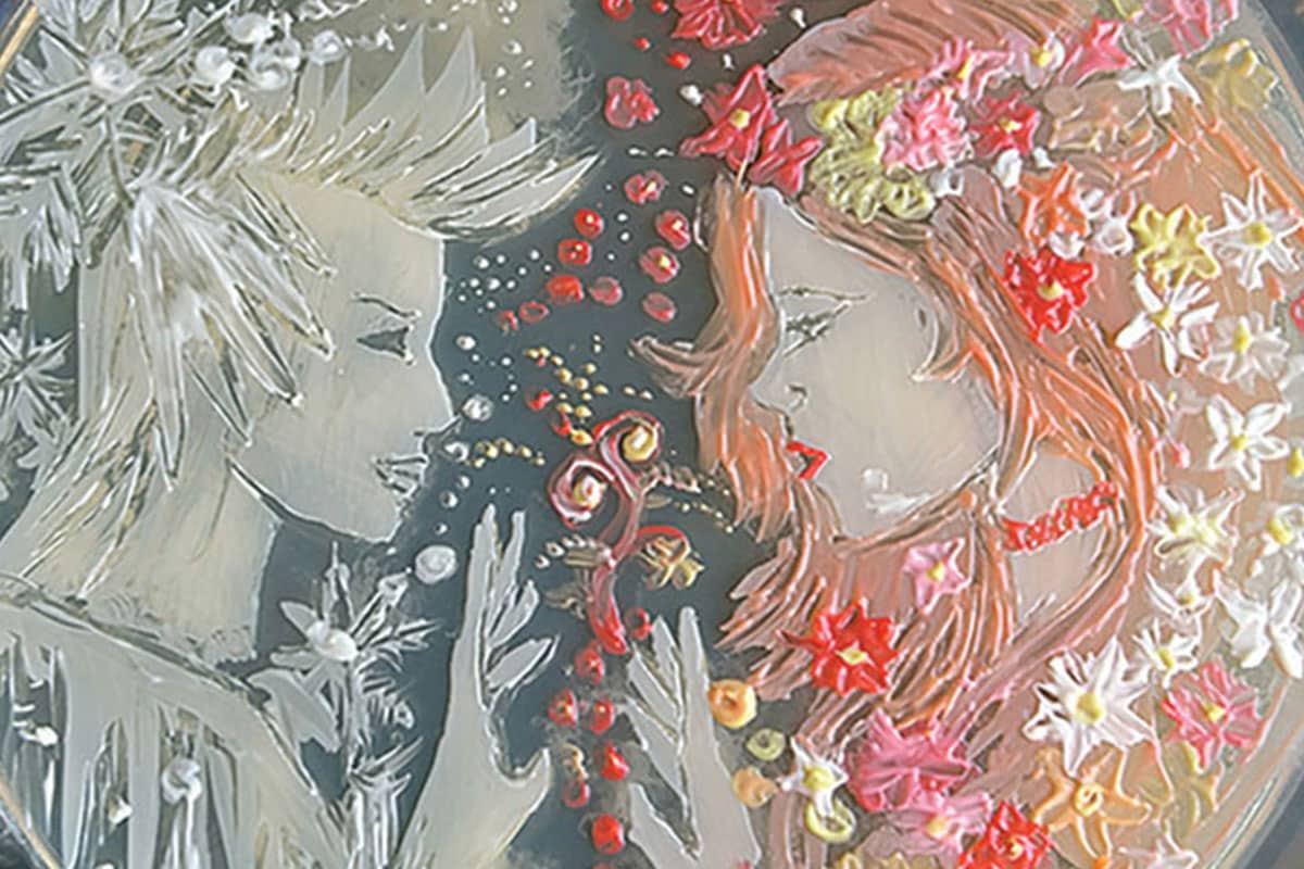Les scènes sont hétéroclites, mais les dessins ont un point commun : ils sont tous tracés avec des microorganismes, les boîtes de Pétri faisant office de toiles. Vertes, jaunes, rouges ou même fluorescentes, bactéries et levures offrent une palette de couleurs impressionnante.
