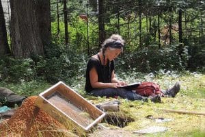 L’archéologue Karine Taché prend des notes de terrain sur le site archéologique au Grand lac Nominingue. Image: Sylvie Constantin