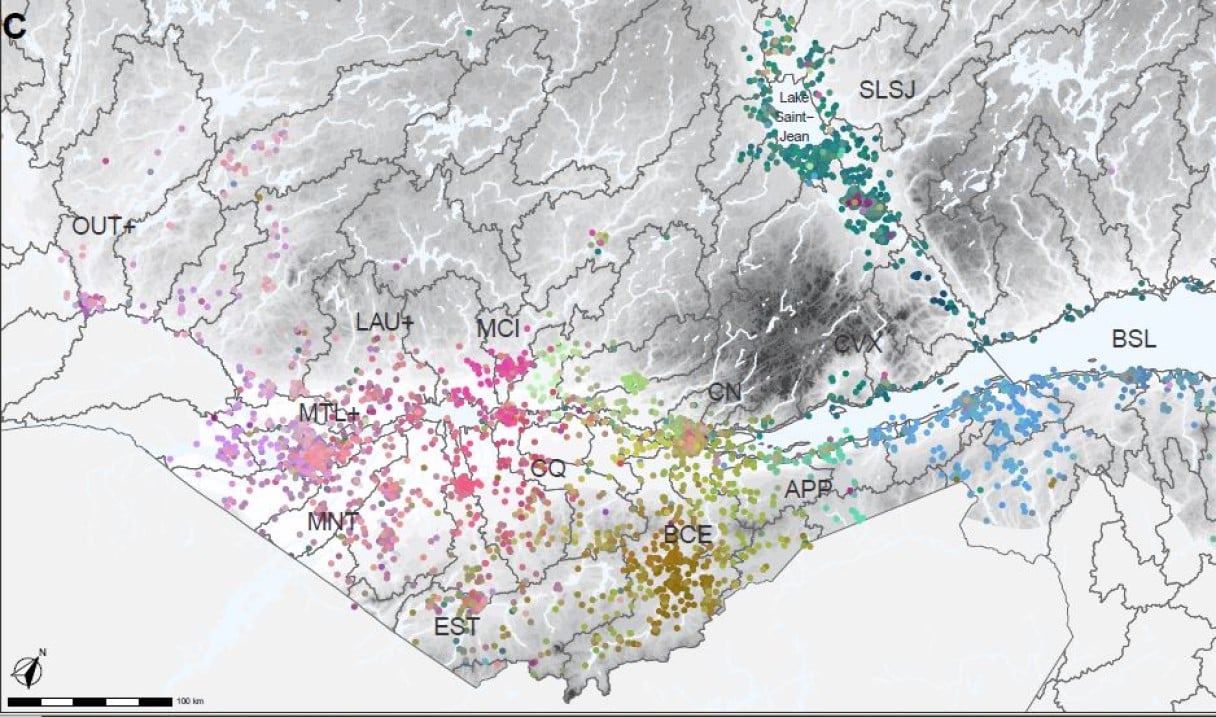 Une carte créée par l’équipe de recherche. Les couleurs marquent les différents regroupements dans l’espace génétique. Elles se collent aux régions du Québec, qui sont souvent séparées par des éléments physiques tels que des montagnes ou des cours d’eau.