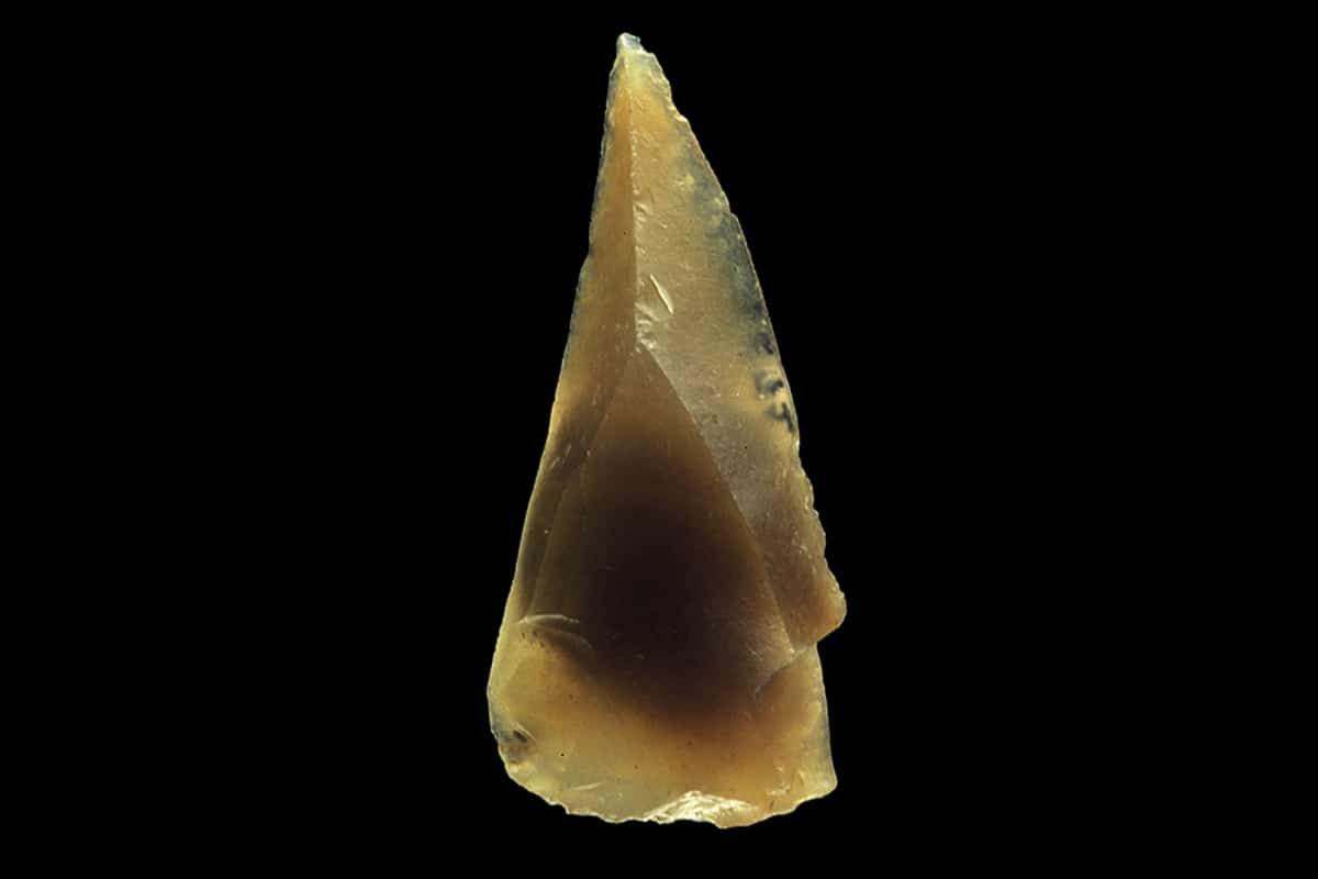 Pointe de silex (moins de 30 mm de long) trouvée dans la strate datée de -54 000 ans. Une molaire a été retrouvée dans la même couche géologique; elle est caractéristique des humains modernes. Image: Ludovic Slimak