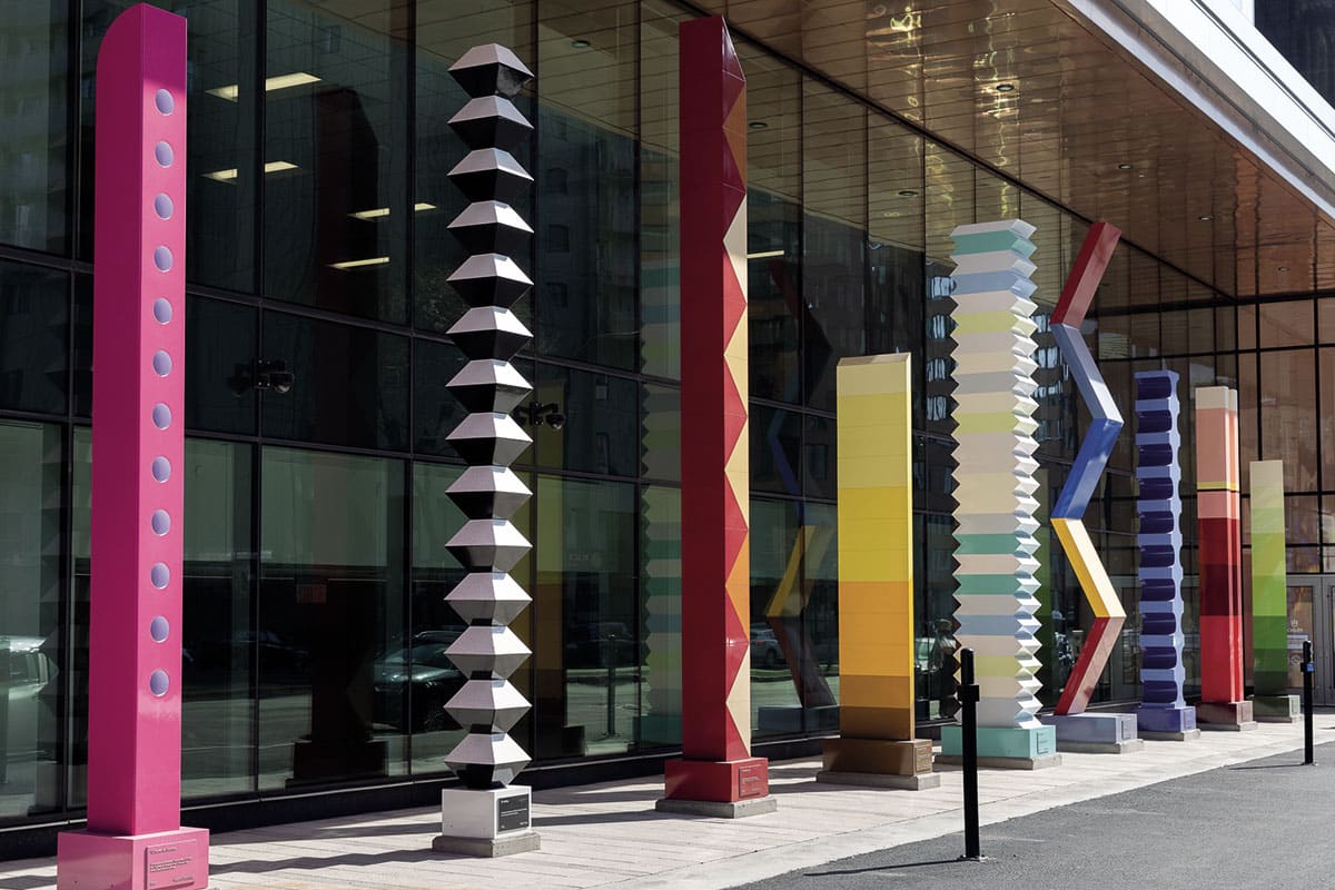 Si vous êtes déjà passé devant le Centre hospitalier de l’Université de Montréal (CHUM), au centre-ville, peut-être avez-vous aperçu la quinzaine de colonnes multicolores qui se dressent boulevard René-Lévesque. De loin, l’œuvre conçue par Marilou Lemmens et Richard Ibghy pourrait passer pour de l’art abstrait avec ses motifs géométriques répétés.
