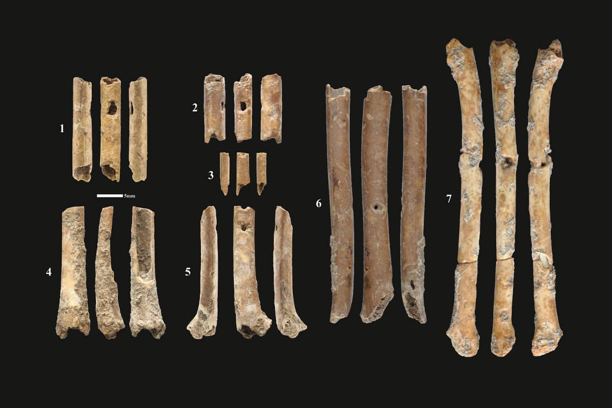 C’est là-bas que Laurent Davin, chercheur à l’Université hébraïque de Jérusalem, effectue ses travaux sur les parures. L’archéologue a scruté en détail les nombreux os d’oiseaux retrouvés sur le site dans l’espoir d’y déceler des traces de prélèvement de plumes. Il en a repéré, mais son inspection lui a permis de faire une découverte encore plus surprenante : celle de sept instruments de musique, semblables à de petites flûtes, sculptés dans les os.