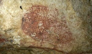Bison dont le corps est dessiné par des points rouges, sur les parois de la grotte de Marsoulas. Image: Carole Fritz
