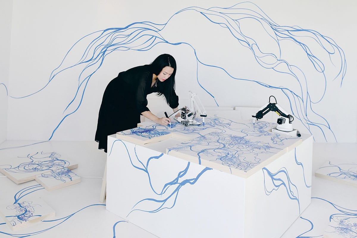 L’artiste Sougwen Chung, qui a fait ses classes en recherche au Massachusetts Institute of Technology, utilise un robot nommé D.O.U.G. qui a analysé 20 ans de son travail et appris à imiter son style. D.O.U.G. lui propose des tracés inventifs, et l’artiste parle donc de cocréation robot-humain. Image: Sougwen Chung