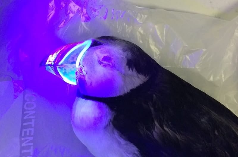Le bec du macareux moine, un oiseau qu’on peut observer aux Îles-de-la-Madeleine et sur la Côte-Nord, prend une allure étonnante sous les rayons ultraviolets (UV).