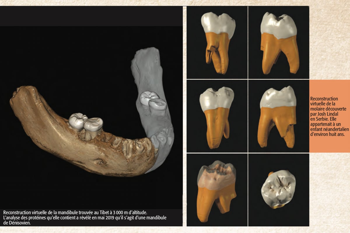 C’est ce qu’a démontré de façon éclatante l’analyse d’une mâchoire mise au jour au Tibet et dévoilée en mai 2019 dans Nature. Âgée de 160 000 ans, elle ne contenait plus d’ADN exploitable. Mais l’équipe chinoise qui l’a étudiée, en collaboration avec l’Institut Max-Planck de Leipzig, a réussi à récupérer du collagène intact dans l’ivoire des dents. Les protéines ont révélé un génome dénisovien, le premier trouvé hors de la grotte de Denisova ! La découverte est immense, puisqu’elle indique notamment que ces humains avaient colonisé les plateaux tibétains à plus de 3 000 m d’altitude bien avant l’arrivée des Homo sapiens.