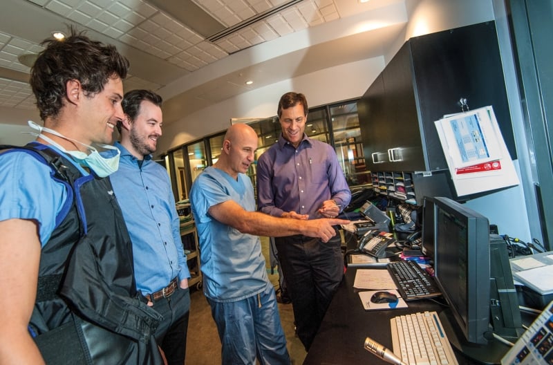 L’angioplastie traditionnelle ne pouvait plus rien pour Jean-Claude Bergeron, un Sherbrookois de 72 ans, qui ne pouvait pas marcher plus de 70 m en raison d’artères bloquées dans les jambes. Ses vaisseaux étaient si obstrués qu’il était impossible d’y insérer un petit ballon gonflable qui, en temps normal, dégage les voies comme le ferait un chasse-neige. Dans une telle situation, les médecins ont recours à la chirurgie, au pontage, voire même à l’amputation. Mais le docteur Andrew Benko avait à sa disposition une nouvelle technologie peu invasive, développée par l’équipe de Martin Brouillette, professeur au département de génie mécanique de l’Université de Sherbrooke. Le 5 décembre 2016, le médecin de l’Hôpital Fleurimont du CIUSSS de l’Estrie a été le premier à s’en servir sur un humain. Il a introduit le fil en titane de 3 m de long dans les artères du septuagénaire jusqu’au lieu de l’occlusion. Puis il a mis la machine en marche.