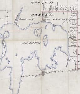 Plan issu de campagnes d’arpentage du 19e siècle sur lequel figurent les espèces d’arbres. Image: Archives du greffe de l’arpenteur général du Québec