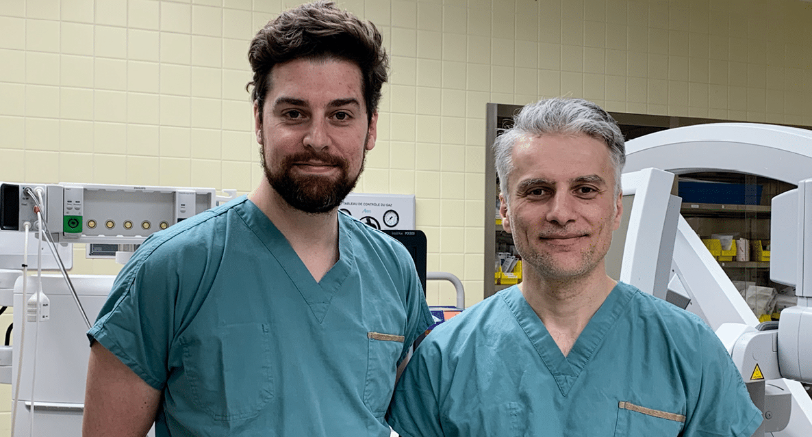 Charles P. Couturier, doc- torant et médecin résident, et Kevin Petrecca, chef du service de neurochirurgie du Centre universitaire de santé McGill. Image: Centre universitaire de santé McGill