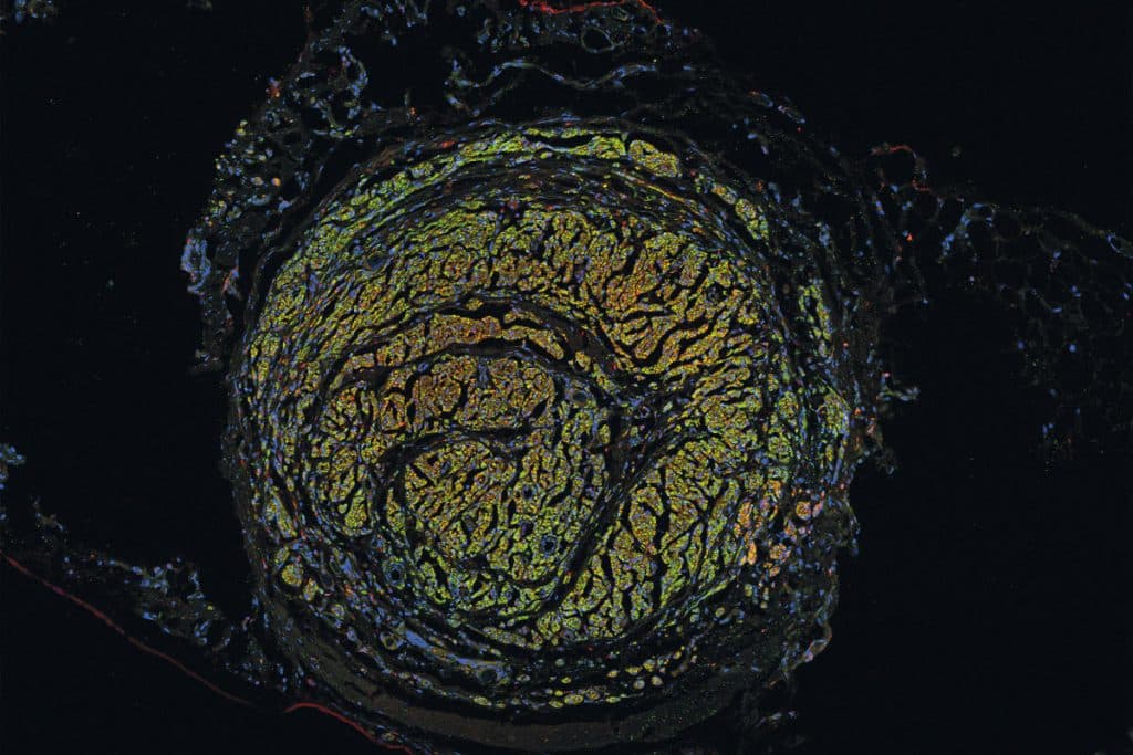 Dans son laboratoire rattaché au Centre de recherche en organogenèse expérimentale de l’Université Laval, situé à l’Hôpital de l’Enfant-Jésus, à Québec, François Berthod travaille d’arrache-pied à développer une meilleure solution. « Nous avons mis au point un tube vivant et prévascularisé afin de faciliter la régénérescence des fibres nerveuses. On le conçoit à partir des propres cellules du patient », indique le professeur au Département de chirurgie. Un tunnel-guide de croissance pour les nerfs, en quelque sorte. Et ça fonctionne ! Sur des souris, du moins. La découverte a été publiée en janvier 2022 dans les pages de