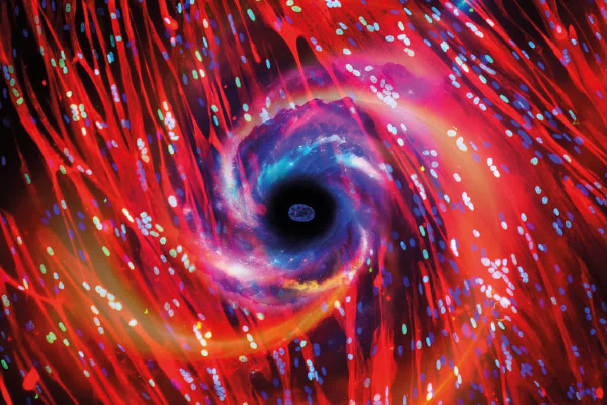 Représentation artistique, à partir d’une image de fibres musculaires d’une personne atteinte de DM1, de l’effet négatif d’une cellule sénescente, au centre.