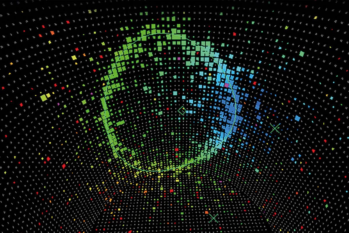 Lorsqu’un neutrino frappe une molécule d’eau dans le détecteur géant SuperKamiokande, situé au Japon, il entraîne indirectement la production d’un signal lumineux capté par les photodé- tecteurs qui tapissent la cuve. Le signal varie selon la saveur du neutrino. Ici, on peut voir la trace laissée par un neutrino électronique. Image : Expérience T2K/Collaboration SuperKamiokande, Institut de recherche sur les rayons cosmiques, Université de Tokyo