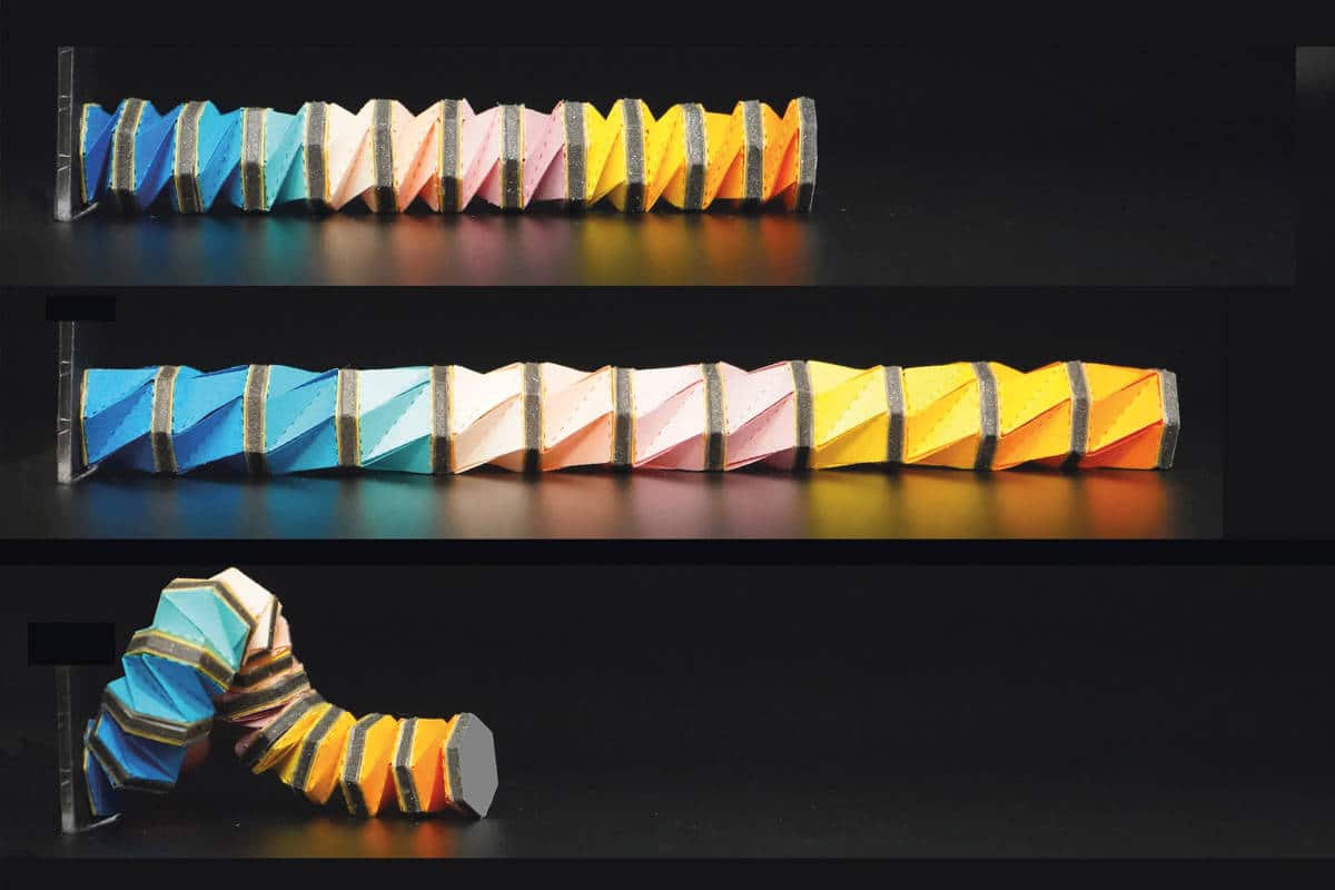 Sans le savoir, je suis peut-être en train d’assister à l’éclosion de leur carrière… scientifique ! Longtemps considéré comme un simple jeu, l’origami, l’art de plier, fait lentement mais sûrement sa place dans les esprits savants du monde entier. Influencés par la nature – une feuille qui se déploie à partir de son bourgeon ou une aile d’insecte qui émerge de sous une carapace –, ils plient toutes sortes de substances : des polymères, des molécules de sucre, du verre ou de la céramique. L’objectif est de leur donner une fonctionnalité mécanique et une flexibilité contrôlable.