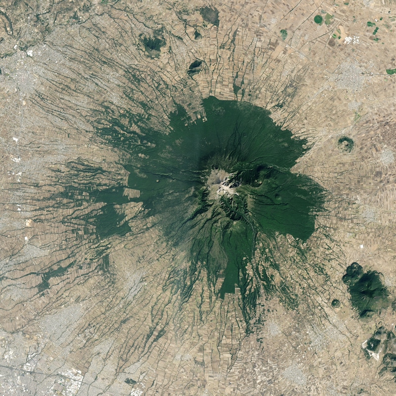 Avec une altitude de 4 462 mètres, le volcan La Malinche, au Mexique, s’élève au-dessus du patchwork de villes, de fermes et de forêts des plaines environnantes. Image: Lauren Dauphin/NASA Earth Observatory