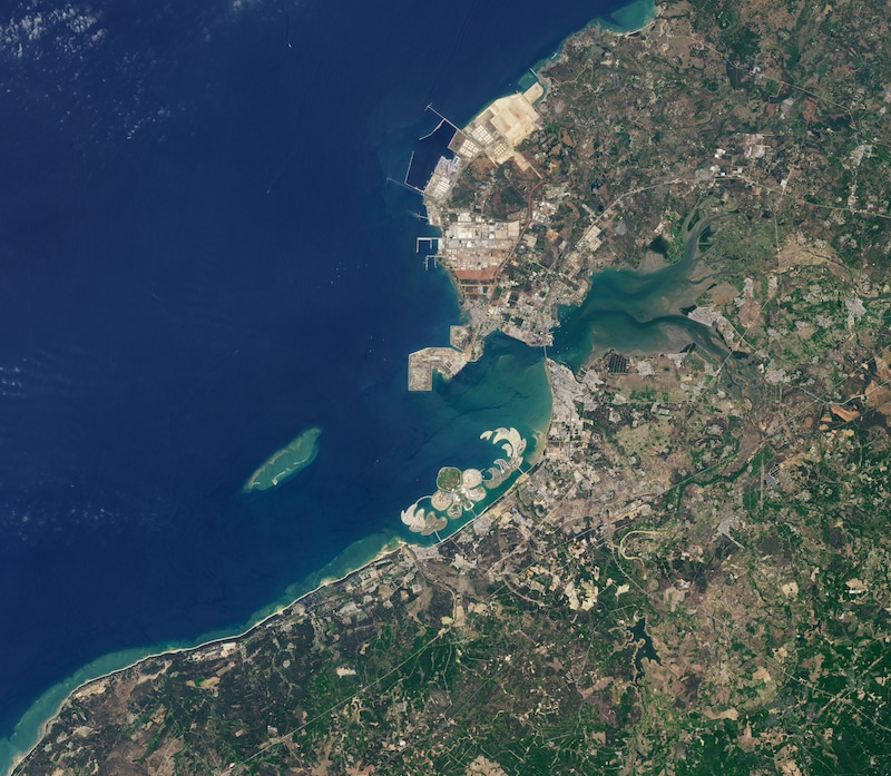 L’île Ocean Flower s’est développée dans les eaux côtières peu profondes près de Hainan, en Chine. Elle s’étend sur environ 8 kilomètres carrés, ce qui la place parmi les plus grandes îles artificielles du monde. Image: NASA Earth Observatory