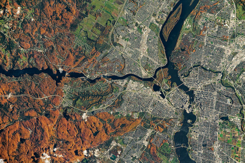 Couleurs d’automne autour d’Ottawa. On voit à gauche le parc de la Gatineau, où les feuilles des érables à sucre et des caryers se colorent d’orange, de rouge et de bronze. Image: NASA-JSC