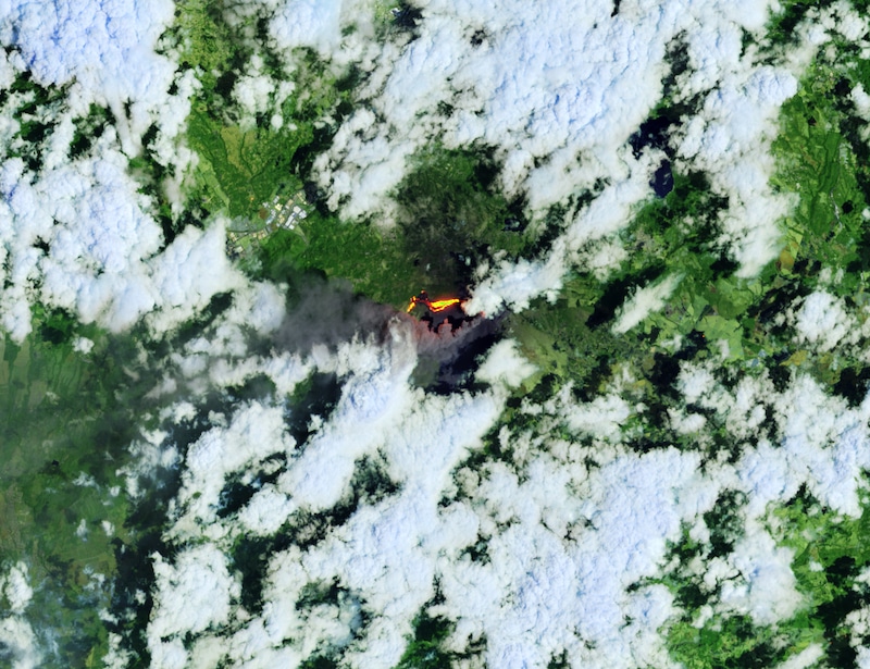 Le Guatemala abrite pas moins de 36 volcans! Ici, entre les nuages perce le volcan de Pacaya, qui entre régulièrement en éruption depuis 1961. Au début de l’année 2021, des panaches de gaz et de cendres se sont élevés jusqu’à 4 500 m. Image: Lauren Dauphin/NASA Earth Observatory