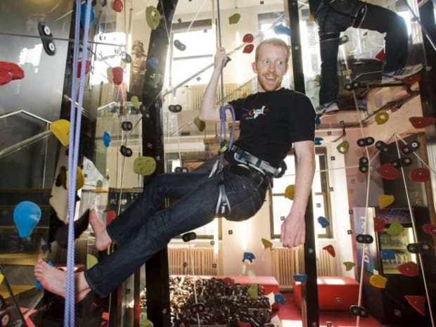 Lorsqu’on entre dans les locaux de Google Montréal (photo ci-haut), on se croirait dans un univers parallèle. Salle de massage, mur d’escalade, aires de repos, fenêtres géantes, espaces de coworking (travail coopératif), stations de bricolage, etc.