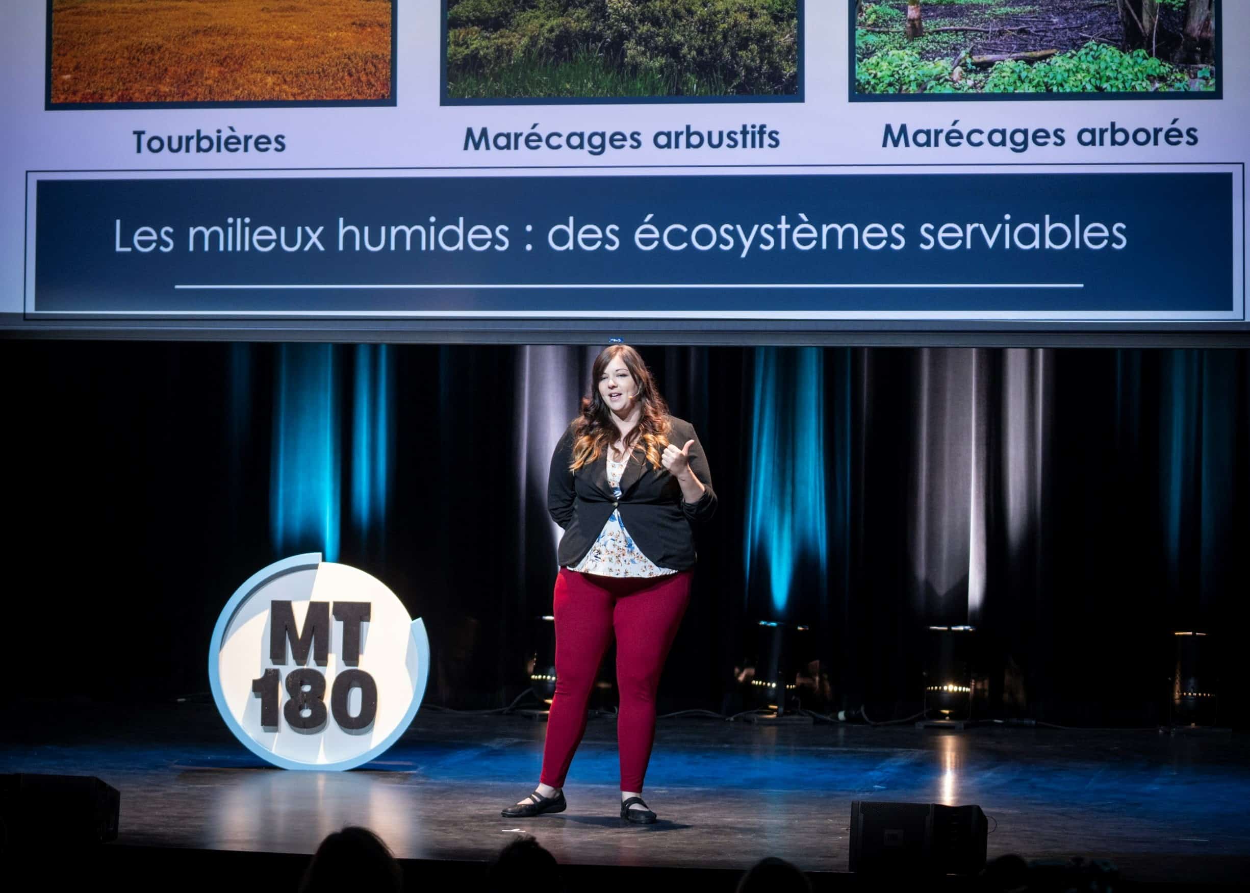 La grande gagnante, Audréanne Loiselle , doctorante à l’Université de Montréal, a conquis à la fois le jury et le public avec sa présentation sur les milieux humides de bord de lac. Elle a d’abord décrit son intérêt pour les tourbières, marais et autres milieux humides, qui remonte à son plus jeune âge.