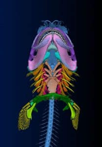 L’image a été réalisée avec la technique de tomodensitométrie (aussi appelée CT-scan ou TACO) qu’on utilise également chez les humains pour voir les différents organes en 3D. « On obtient plein de photos de couches transversales du spécimen que l’on rassemble grâce à un logiciel ». Il lui a fallu plusieurs heures afin de séparer et identifier chacune des structures du squelette cartilagineux du requin. Le résultat est haut en couleurs. « J’ai choisi de mettre de la couleur à ce squelette pour montrer à quel point il y a énormément d’éléments différents qui le composent. »