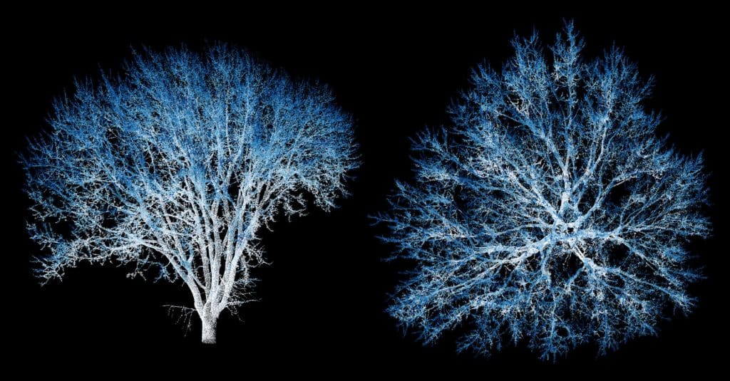 De son côté, Bastien Lecigne, doctorant en biologie à l’Université du Québec à Montréal, propose une vue originale d’un érable sous le poids du verglas. Ses collègues et lui voulaient mieux comprendre le phénomène d’accumulation de la glace dans les arbres. À l’aide d’un lidar, une technologie de détection au laser, ils ont donc scanné des érables en parcourant les routes du Québec pour obtenir ensuite une image 3D de leur structure.