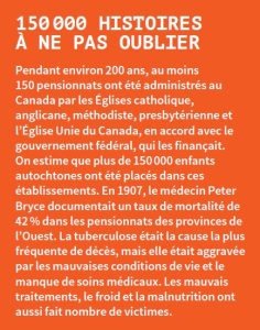 Si le Centre national pour la vérité et la réconciliation (CNVR) estime qu’environ 4100 enfants ayant fréquenté les pensionnats n’en sont jamais revenus (un nombre probablement sous-estimé), les proportions monstrueuses du drame ont éclaté au grand jour au printemps 2021. Coup sur coup, plusieurs Premières Nations ont annoncé des chiffres terrifiants après des recherches par géoradar : la nation Tk’emlúps te Secwépemc a rapporté la présence de 215 « tombes d’enfants » sur le terrain de Kamloops, en Colombie-Britannique ; dans la même province, autour de l’ancienne St. Eugene’s Mission School, 182 tombes potentielles ont été détectées par la nation Ktunaxa ; et le nombre de 751 a été avancé par la Première Nation de Cowessess, en Saskatchewan, sur le site de l’ancien pensionnat de Marieval.