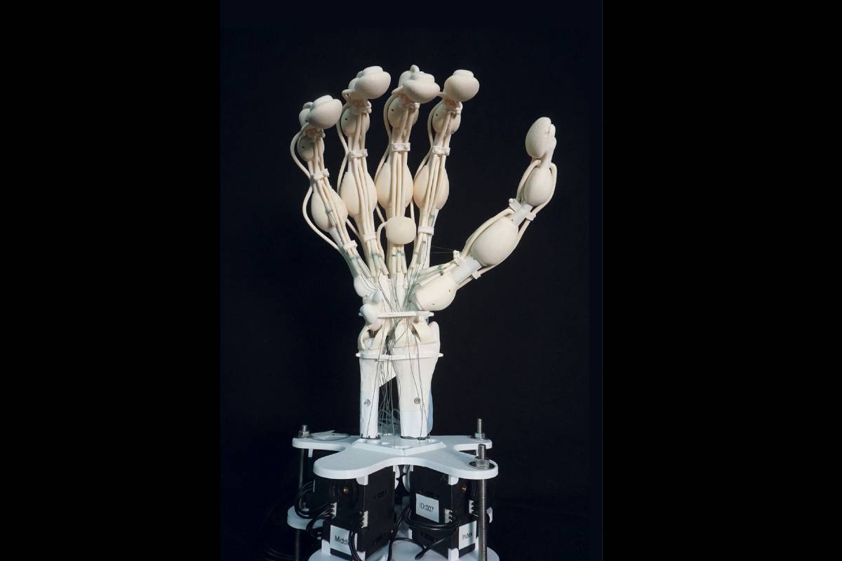Cette main robotisée aux allures de décoration d’Halloween est loin d’être un jouet en plastique banal. Les différentes composantes n’ont pas été assemblées, mais bien imprimées d’une traite en 3D par des scientifiques de l’École polytechnique fédérale de Zurich avec des polymères d’élasticités différentes. Ainsi, la main – fonctionnelle – est constituée de faux os, ligaments et tendons, articulés de façon complexe et imitant les structures biologiques.