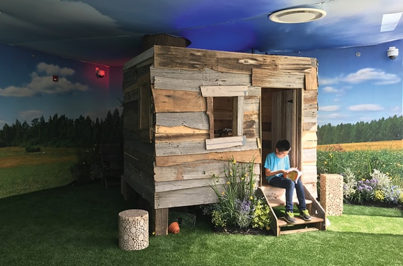 La première reproduit une cour arrière où l’on peut se réfugier dans une cabane en bois, respirer l’odeur de l’herbe fraîchement coupée et se laisser bercer par des chants d’oiseaux. Dans la seconde, on pénètre dans une bibliothèque où flotte le parfum du cuir ou des livres – des odeurs sélectionnées selon les objectifs des scientifiques.