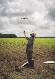 Cyrille Tremblay, technologue agricole, relève la densité de plants sur des parcelles d’Agri-Fusion grâce à un drone. Photo: Donald Robitaille