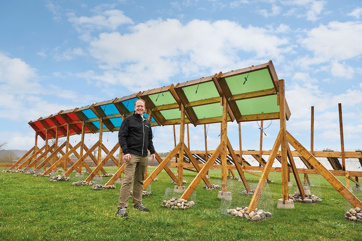 Joshua Pearce, professeur à l’Université Western, sous des panneaux solaires semi-transparents. Photo: Kathryn Hollinrake