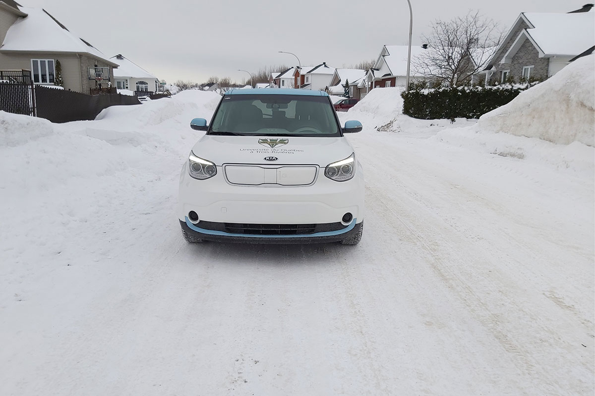 Le professeur Sousso Kelouwani est assis derrière le volant, mais n’y touche pas. C’est plutôt moi, sur la banquette arrière de la Kia électrique, qui le fait tourner et qui active l’accélérateur ou les freins. Tout cela grâce à une manette de jeu vidéo ! « Ne vous inquiétez pas, je peux désactiver la manette simplement en touchant le volant ou la pédale, me dit le chercheur. Attention au piéton devant ! » Oui, bien sûr !