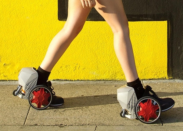 patins aux allures de mini-fauteuils roulants se contrôlent par les mouvements d’un des deux pieds. Abaisser les orteils le fait accélérer, alors que planter le talon le fait ralentir. Connecté sans fil, l’autre patin obéit aux ordres du premier.